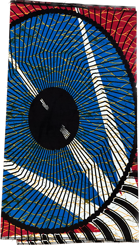 A stiff non-stretch 80" x 20" cotton fabric. The colors in this wrap are blue, red, white, black, and traces of orange.