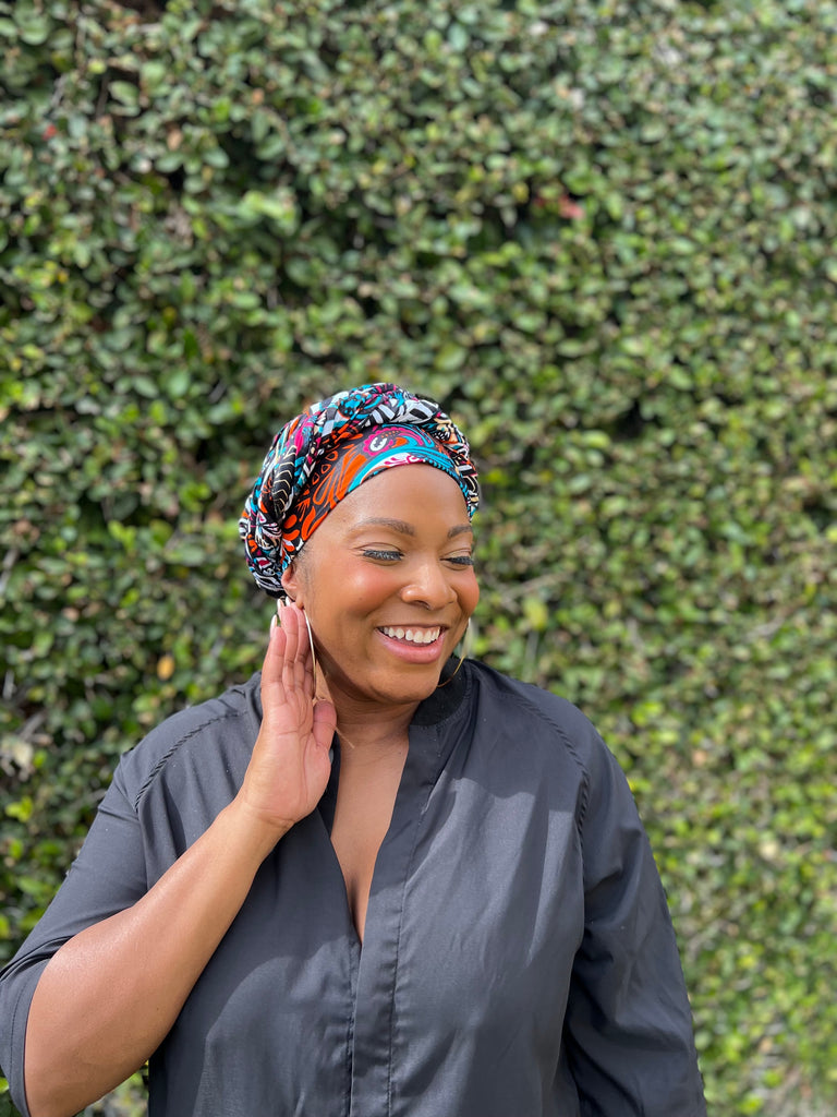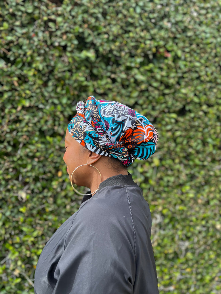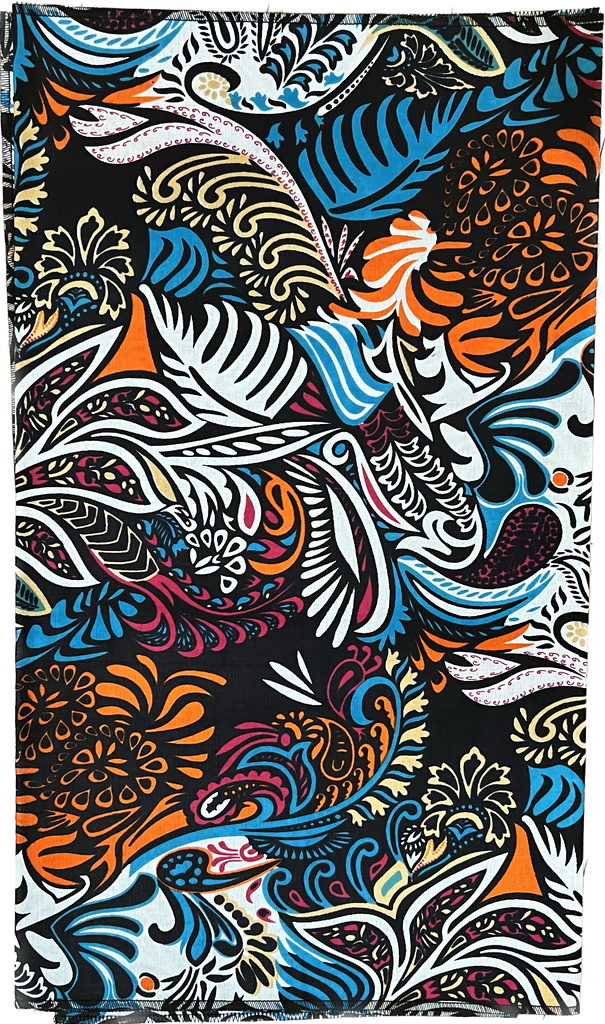 A stiff non-stretch 80" x 20" cotton fabric. The colors in this wrap are teal, white, tan, orange, and fuschia.